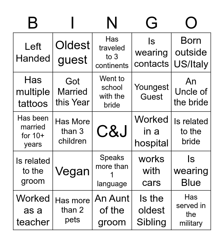 This bingo card has a free space and 24 words: Vegan, Has more than 2 pets, Went to school with the bride, Worked as a teacher, Born outside US/Italy, Left Handed, Has multiple tattoos, Oldest guest, Worked in a hospital, Speaks more than 1 language, Youngest Guest, Has been married for 10+ years, works with cars, Is wearing Blue, Got Married this Year, Is the oldest Sibling, Is related to the bride, Has traveled to 3 continents, An Uncle of the bride, Has More than 3 children, Has served in the military, Is related to the groom, Is wearing contacts and An Aunt of the groom.