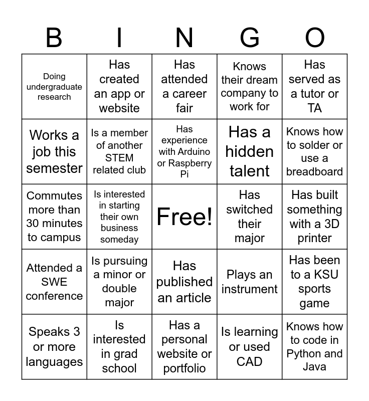 This bingo card has a free space and 29 words: Speaks 3 or more languages, Interned over the summer, Is interested in starting their own business someday, Has participated in a hackathon, Doing undergraduate research, Has attended a career fair, Is a member of another STEM related club, Is pursuing a minor or double major, Has switched their major, Is interested in grad school, Has built something with a 3D printer, Knows how to code in Python and Java, Has a personal website or portfolio, Is learning or used CAD, Knows how to solder or use a breadboard, Has participated in a robotics competition, Has published an article, Attended a SWE conference, Has served as a tutor or TA, Commutes more than 30 minutes to campus, Plays an instrument, Has traveled to another continent, Has a hidden talent, Works a job this semester, Knows their dream company to work for, Has created an app or website, Has been to a KSU sports game, Has experience with Arduino or Raspberry Pi and Has built or fixed a PC.