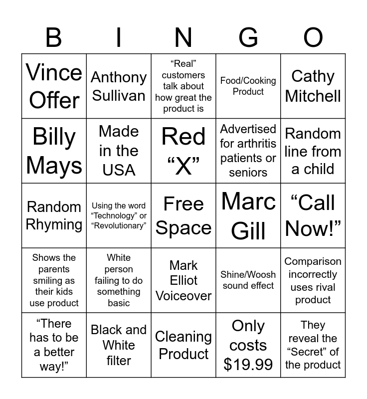 This bingo card has a free space and 24 words: White person failing to do something basic, Black and White filter, Red “X”, “There has to be a better way!”, Cathy Mitchell, Vince Offer, Billy Mays, Anthony Sullivan, Marc Gill, Mark Elliot Voiceover, Advertised for arthritis patients or seniors, Random Rhyming, Shine/Woosh sound effect, Comparison incorrectly uses rival product, Made in the USA, Only costs $19.99, “Call Now!”, “Real” customers talk about how great the product is, Random line from a child, Using the word “Technology” or “Revolutionary”, They reveal the “Secret” of the product, Shows the parents smiling as their kids use product, Food/Cooking Product and Cleaning Product.