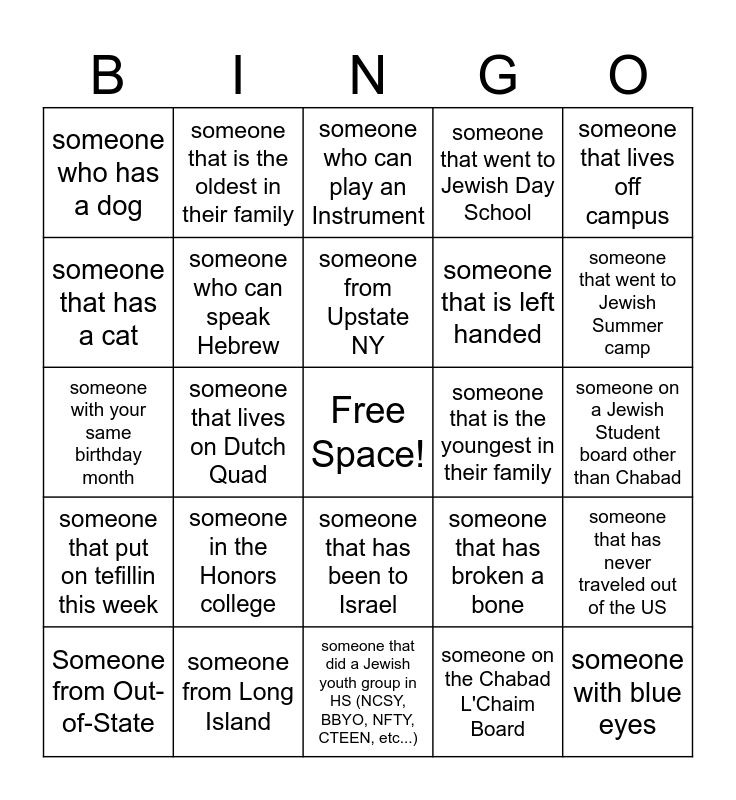 This bingo card has a free space and 24 words: someone in the Honors college, someone from Long Island, someone from Upstate NY, Someone from Out-of-State, someone that lives off campus, someone who has a dog, someone that has a cat, someone that is the oldest in their family, someone that is the youngest in their family, someone that has been to Israel, someone that is left handed, someone with your same birthday month, someone that has broken a bone, someone that has never traveled out of the US, someone who can speak Hebrew, someone on the Chabad L'Chaim Board, someone on a Jewish Student board other than Chabad, someone who can play an Instrument, someone that went to Jewish Summer camp, someone that lives on Dutch Quad, someone with blue eyes, someone that put on tefillin this week, someone that went to Jewish Day School and someone that did a Jewish youth group in HS (NCSY, BBYO, NFTY, CTEEN, etc...).