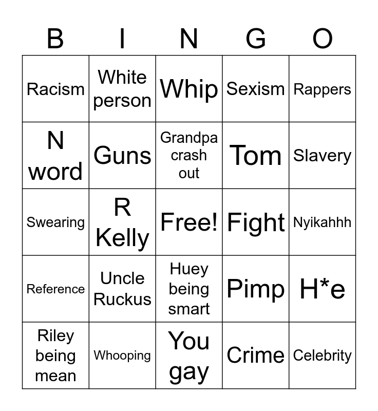This bingo card has a free space and 24 words: Uncle Ruckus, Whooping, Grandpa crash out, Riley being mean, Rappers, Racism, N word, White person, Fight, Huey being smart, Tom, Swearing, Pimp, H*e, Guns, Crime, Nyikahhh, Whip, Slavery, R Kelly, Celebrity, Reference, Sexism and You gay.