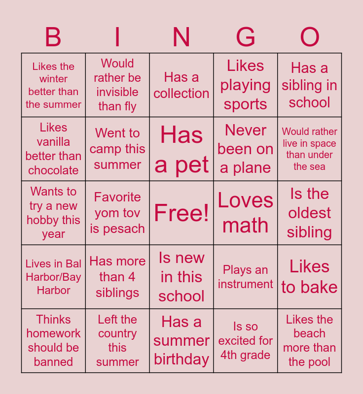 This bingo card has a free space and 24 words: Has more than 4 siblings, Left the country this summer, Has a pet, Thinks homework should be banned, Has a sibling in school, Likes the winter better than the summer, Likes vanilla better than chocolate, Would rather be invisible than fly, Loves math, Is new in this school, Never been on a plane, Wants to try a new hobby this year, Plays an instrument, Likes to bake, Went to camp this summer, Is so excited for 4th grade, Is the oldest sibling, Has a collection, Would rather live in space than under the sea, Favorite yom tov is pesach, Likes the beach more than the pool, Lives in Bal Harbor/Bay Harbor, Likes playing sports and Has a summer birthday.