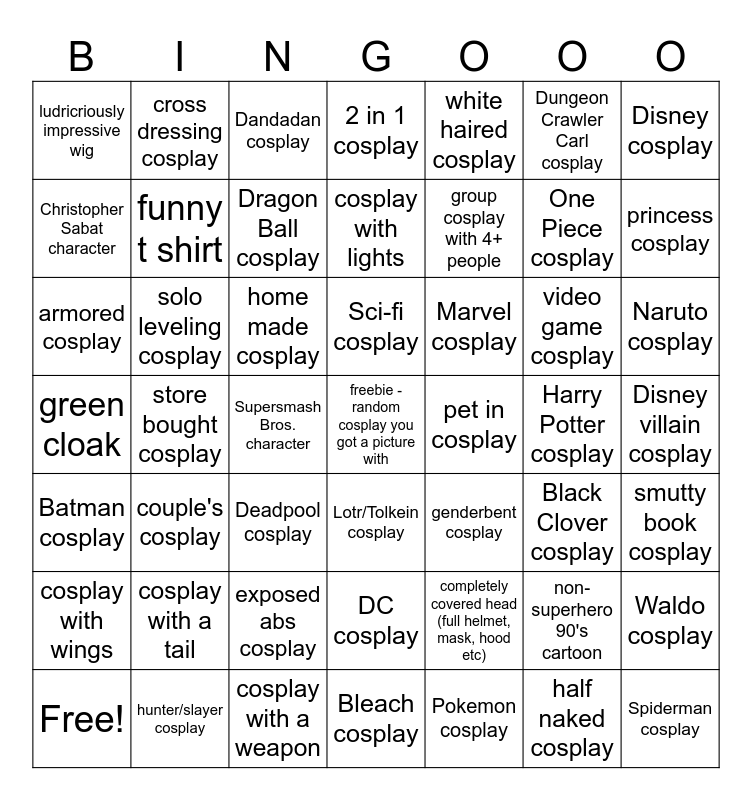 This bingo card has 51 words: Free!, One Piece cosplay, Spiderman cosplay, store bought cosplay, home made cosplay, genderbent cosplay, cross dressing cosplay, Pokemon cosplay, Dungeon Crawler Carl cosplay, Black Clover cosplay, Disney cosplay, 2 in 1 cosplay, video game cosplay, Marvel cosplay, DC cosplay, Batman cosplay, Christopher Sabat character, princess cosplay, hunter/slayer cosplay, white haired cosplay, group cosplay with 4+ people, Supersmash Bros. character, ludricriously impressive wig, funny t shirt, cosplay with a weapon, freebie - random cosplay you got a picture with, Dragon Ball cosplay, Bleach cosplay, Naruto cosplay, Dandadan cosplay, geriatric cosplay, couple's cosplay, exposed abs cosplay, completely covered head (full helmet, mask, hood etc), Lotr/Tolkein cosplay, green cloak, Harry Potter cosplay, smutty book cosplay, cosplay with wings, cosplay with a tail, armored cosplay, solo leveling cosplay, non-superhero 90's cartoon, half naked cosplay, pet in cosplay, Disney villain cosplay, cosplay with lights, Deadpool cosplay, Waldo cosplay, Sci-fi cosplay and carpet cosplay.