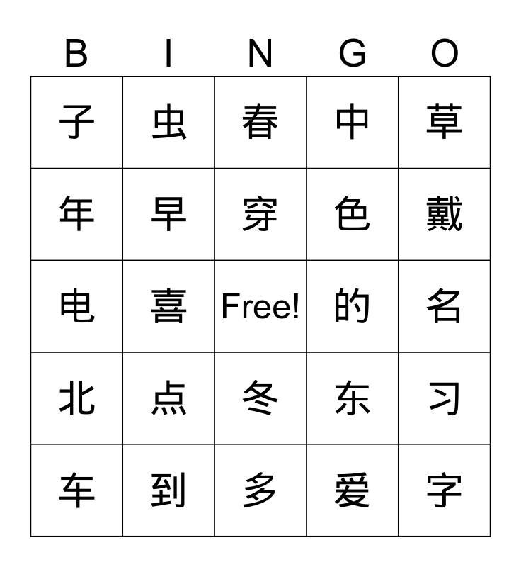 This bingo card has a free space and 34 words: 八, 爱, 百, 爸, 北, 早, 草, 车, 虫, 出, 穿, 春, 大, 地, 的, 戴, 到, 电, 点, 东, 冬, 儿, 子, 名, 多, 字, 中, 岁, 色, 年, 欢, 喜, 习 and 西.