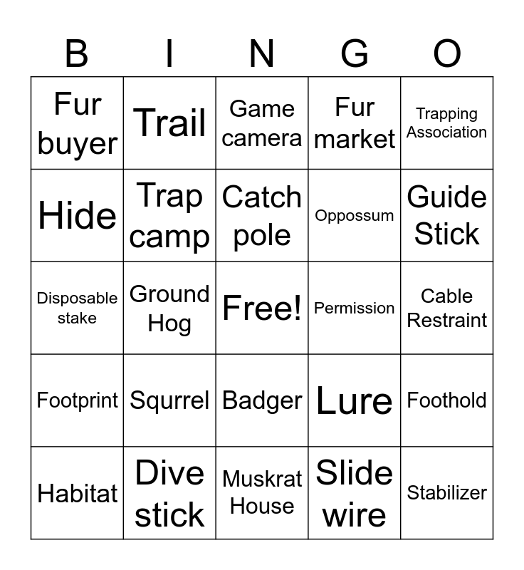 This bingo card has a free space and 91 words: Anchor, Auction house, Badger, Bait, Bank den, Bear Trap, Beaver, Beaver lodge, Black Bear, Blood Trail, Bobcat, Bodygrip, Box Trap, Cable Restraint, Cage Trap, Catch pole, Chipmunk, Coilspring, Coyote, Cubby, Deer, Den Tree, Muskrat House, Dirt Hole, Disposable stake, Dive stick, Dog proof, Drowning Rod, Education, Elk, Fisher, Foothold, Feeder Hut, Footprint, Fur buyer, Fur market, Game camera, Grey Fox, Ground Hog, Guide Stick, Habitat, Hide, Jaw Spread, Live Trap, Location, Lure, Lynx, Marsh, Marten, Mink, Muskrat, Oppossum, Otter, Pan, Paw, Pelt, Permission, Rabbit, Raccoon, Rebar, Red Fox, Regulations, Scat, Scent, Set, Sifter, Skunk, Slide wire, Snare, Spring, Squrrel, Stabilizer, Tanned, Track, Trail, Trap camp, Trap Dye, Trap Tag, Trap Wax, Trapline, Trapper, Trapping Association, Trapping License, Trigger, Tube trap, Waders, Weasel, Wildlife, Wire, Wolf and Woodchuck.