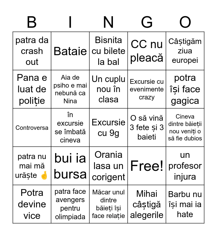 This bingo card has 25 words: bui ia bursa, Măcar unul dintre băieți își face relație, Un cuplu nou în clasa, Potra devine vice, Câștigăm ziua europei, patra da crash out, Pana e luat de poliție, Bataie, O să vină 3 fete și 3 baieti, Orania lasa un corigent, Excursie cu evenimente crazy, Controversa, Free!, un profesor injura, Aia de psiho e mai nebună ca Nina, Barbu nu își mai ia hate, Cineva dintre băieții nou veniți o să fie dubios, Bisnita cu bilete la bal, potra își face gagica, în excursie se îmbată cineva, Excursie cu 9g, patra face avengers pentru olimpiada, patra nu mai mă urăște 🤞, CC nu pleacă and Mihai câștigă alegerile.