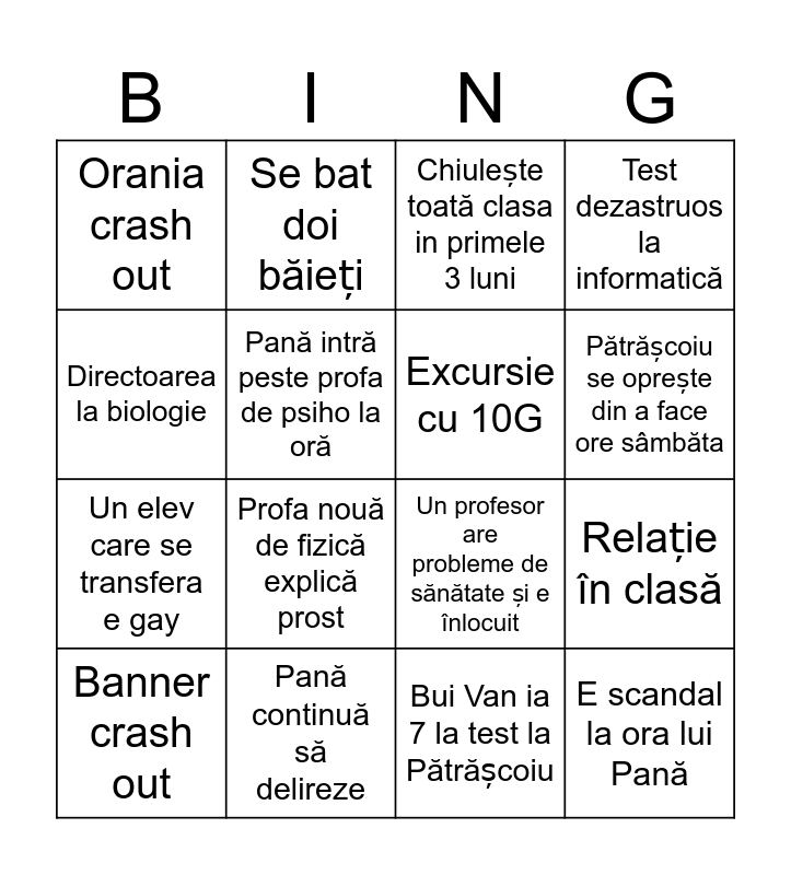 This bingo card has 16 words: Pană continuă să delireze, Relație în clasă, Chiulește toată clasa in primele 3 luni, Orania crash out, Un elev care se transfera e gay, Se bat doi băieți, Un profesor are probleme de sănătate și e înlocuit, Bui Van ia 7 la test la Pătrășcoiu, Directoarea la biologie, Pană intră peste profa de psiho la oră, Banner crash out, Test dezastruos la informatică, Profa nouă de fizică explică prost, Pătrășcoiu se oprește din a face ore sâmbăta, Excursie cu 10G and E scandal la ora lui Pană.