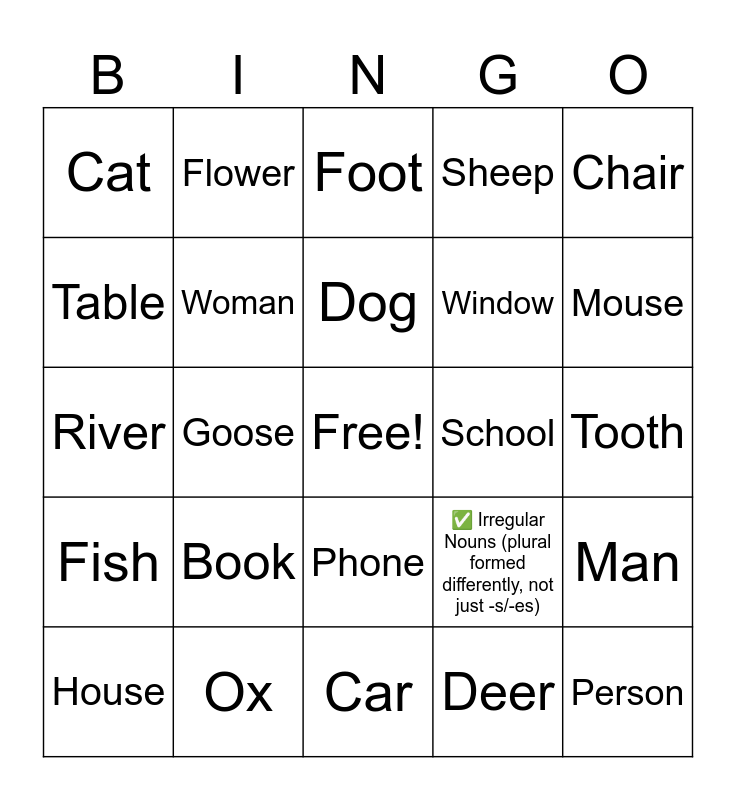 This bingo card has a free space and 25 words: Book, Car, Dog, House, Chair, Cat, Table, Flower, School, Phone, Window, River, ✅ Irregular Nouns (plural formed differently, not just -s/-es), Man, Woman, Child, Tooth, Foot, Mouse, Goose, Person, Ox, Fish, Sheep and Deer.