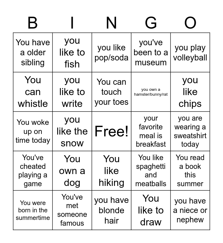 This bingo card has a free space and 24 words: You own a dog, You've met someone famous, You can touch your toes, You were born in the summertime, you play volleyball, You have a older sibling, You can whistle, you like to fish, your favorite meal is breakfast, You like hiking, you own a hamster/bunny/rat, You woke up on time today, You like spaghetti and meatballs, You read a book this summer, you like to write, You like to draw, you are wearing a sweatshirt today, you like pop/soda, you like chips, you like the snow, you have a niece or nephew, You've cheated playing a game, you've been to a museum and you have blonde hair.