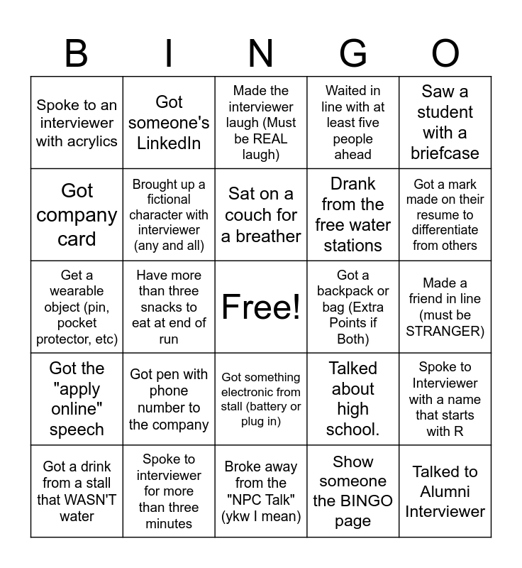 This bingo card has a free space and 24 words: Got pen with phone number to the company, Spoke to interviewer for more than three minutes, Sat on a couch for a breather, Got a drink from a stall that WASN'T water, Saw a student with a briefcase, Spoke to an interviewer with acrylics, Got company card, Got someone's LinkedIn, Got a backpack or bag (Extra Points if Both), Got something electronic from stall (battery or plug in), Drank from the free water stations, Get a wearable object (pin, pocket protector, etc), Talked about high school., Spoke to Interviewer with a name that starts with R, Brought up a fictional character with interviewer (any and all), Show someone the BINGO page, Made a friend in line (must be STRANGER), Made the interviewer laugh (Must be REAL laugh), Got a mark made on their resume to differentiate from others, Have more than three snacks to eat at end of run, Talked to Alumni Interviewer, Got the "apply online" speech, Waited in line with at least five people ahead and Broke away from the "NPC Talk" (ykw I mean).