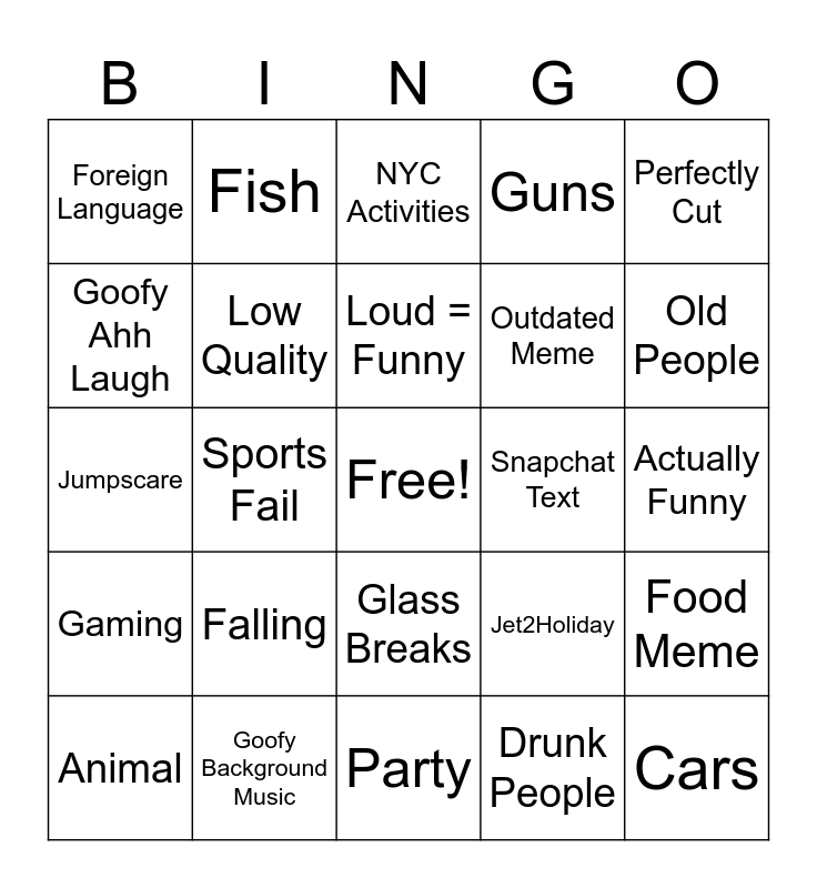 This bingo card has a free space and 24 words: Falling, Goofy Background Music, Loud = Funny, Animal, Perfectly Cut, Foreign Language, Goofy Ahh Laugh, Fish, Snapchat Text, Glass Breaks, Outdated Meme, Jumpscare, Jet2Holiday, Food Meme, Low Quality, Drunk People, Actually Funny, NYC Activities, Old People, Sports Fail, Cars, Gaming, Guns and Party.