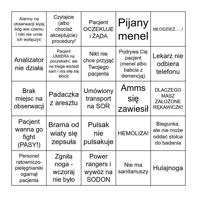 This bingo card has 25 words: Brama od wiaty się zepsuła, Power rangers i wywóz na SODON, Nikt nie chce przyjąć Twojego pacjenta, Personel ratowniczo-pielęgniarski ogarnął pacjenta, MŁODZIEŻ…..!, Alarmy na obserwacji wyją bóg wie czemu i nikt nie umie ich wyłączyć, Analizator nie działa, Czytajcie (albo chociaż akceptujcie) procedury!, Amms się zawiesił, Pulsak nie pulsakuje, Podrywa Cię pacjent (menel albo babcia z demencją), Brak miejsc na obserwacji, HEMOLIZA!, Biegunka, ale nie może oddać stolca do badania, Pacjent UMIERA na poczekalni, ale na triage wszedł sam i ma siłę się kłócić, Hulajnoga, DLACZEGO MASZ ZAŁOŻONE RĘKAWICZKI, Pacjent OCZEKUJE i ŻĄDA, Lekarz nie odbiera telefonu, Padaczka z aresztu, Umówiony transport na SOR, Zgniła noga - wczoraj nie było, Pacjent wanna go fight (PASY!), Pijany menel and Nie ma sanitariuszy.