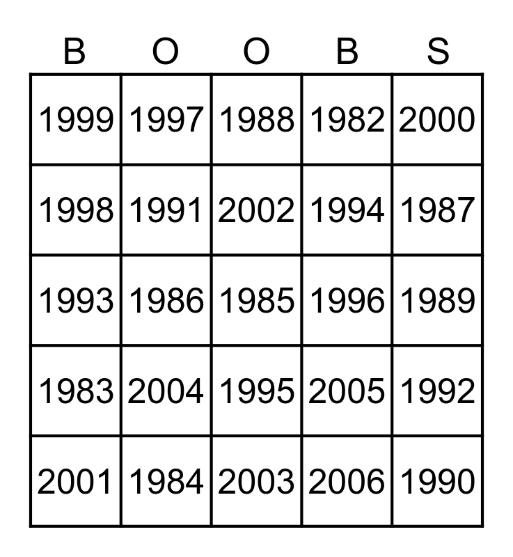 This bingo card has 25 words: 2004, 2003, 2002, 2001, 2000, 1999, 1998, 1997, 1996, 1995, 1994, 1993, 2005, 1992, 1991, 1990, 1989, 1988, 1987, 1986, 1985, 1984, 1983, 1982 and 2006.