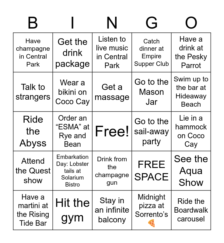 This bingo card has a free space and 25 words: Embarkation Day: Lobster tails at Solarium Bistro, Stay in an infinite balcony, Get a massage, Have a martini at the Rising Tide Bar, Have a drink at the Pesky Parrot, Have champagne in Central Park, Talk to strangers, Get the drink package, Go to the sail-away party, Drink from the champagne gun, Go to the Mason Jar, Ride the Abyss, FREE SPACE, See the Aqua Show, Wear a bikini on Coco Cay, Wave to passengers on a neighbor ship, Lie in a hammock on Coco Cay, Listen to live music in Central Park, Swim up to the bar at Hideaway Beach, Order an “ESMA” at Rye and Bean, Ride the Boardwalk carousel, Hit the gym, Attend the Quest show, Catch dinner at Empire Supper Club and Midnight pizza at Sorrento’s 🍕.