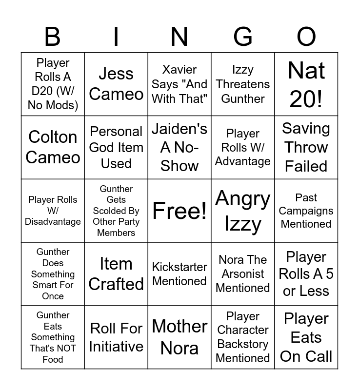 This bingo card has a free space and 24 words: Item Crafted, Roll For Initiative, Jaiden's A No-Show, Gunther Eats Something That's NOT Food, Nat 20!, Player Rolls A D20 (W/ No Mods), Colton Cameo, Jess Cameo, Angry Izzy, Kickstarter Mentioned, Player Rolls W/ Advantage, Player Rolls W/ Disadvantage, Nora The Arsonist Mentioned, Player Rolls A 5 or Less, Personal God Item Used, Player Character Backstory Mentioned, Past Campaigns Mentioned, Xavier Says "And With That", Saving Throw Failed, Gunther Gets Scolded By Other Party Members, Player Eats On Call, Gunther Does Something Smart For Once, Izzy Threatens Gunther and Mother Nora.