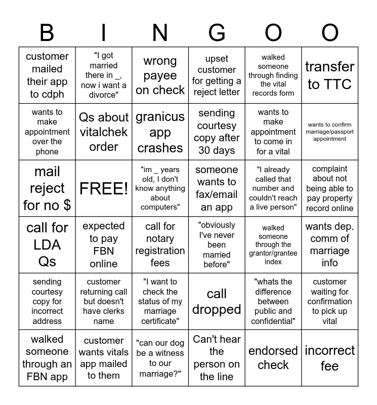 This bingo card has 42 words: endorsed check, Qs about vitalchek order, transfer to recording, "I already called that number and couldn't reach a live person", wants dep. comm of marriage info, expected to pay FBN online, mail reject for no $, amendment questions, wrong payee on check, complaint about not being able to pay property record online, "im _ years old, I don't know anything about computers", sending courtesy copy after 30 days, wants to confirm marriage/passport appointment, walked someone through finding the vital records form, customer wants vitals app mailed to them, call for LDA Qs, customer waiting for confirmation to pick up vital, wants to make appointment to come in for a vital, incorrect fee, "I got married there in _, now i want a divorce", transfer to TTC, "I want to check the status of my marriage certificate", sending courtesy copy for incorrect address, customer mailed their app to cdph, "can I get my niece/nephew's birth certificate", walked someone through an FBN app, granicus app crashes, yelled at for not having court records, customer returning call but doesn't have clerks name, "whats the difference between public and confidential", "Im officiating a wedding, what does your office need from me?", someone wants to fax/email an app, wants to make appointment over the phone, walked someone through the grantor/grantee index, "can our dog be a witness to our marriage?", call for notary registration fees, "obviously I've never been married before", FREE!, call dropped, Can't hear the person on the line, upset customer for getting a reject letter and "I need to get my marriage certificate for the real ID".