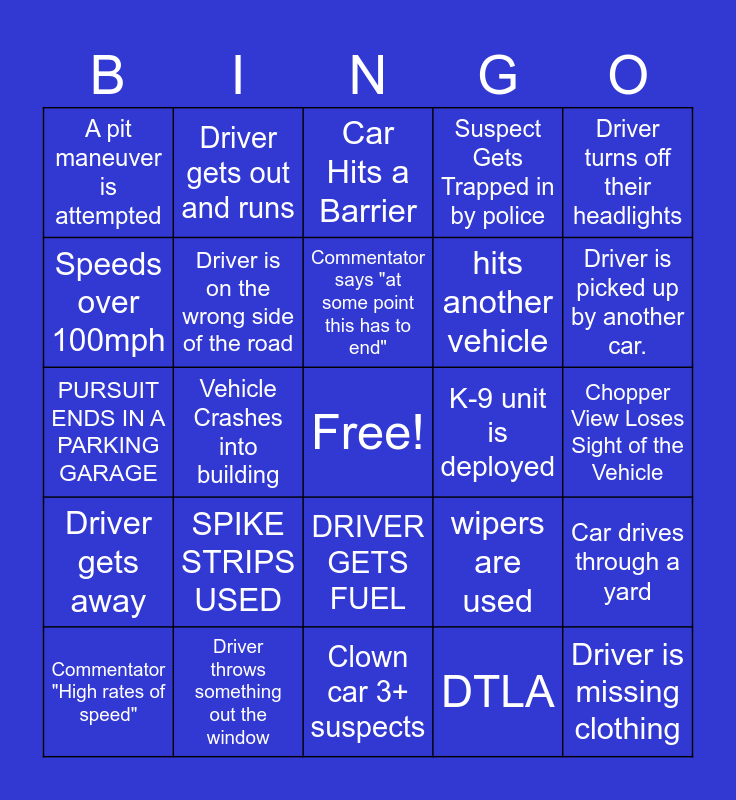 This bingo card has a free space and 24 words: SPIKE STRIPS USED, Driver throws something out the window, Commentator says "at some point this has to end", Commentator "High rates of speed", Driver turns off their headlights, A pit maneuver is attempted, Speeds over 100mph, Driver gets out and runs, K-9 unit is deployed, DRIVER GETS FUEL, hits another vehicle, PURSUIT ENDS IN A PARKING GARAGE, wipers are used, Car drives through a yard, Driver is on the wrong side of the road, DTLA, Chopper View Loses Sight of the Vehicle, Car Hits a Barrier, Driver is picked up by another car., Vehicle Crashes into building, Driver is missing clothing, Driver gets away, Suspect Gets Trapped in by police and Clown car 3+ suspects.
