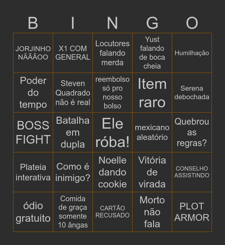 This bingo card has a free space and 24 words: Como é inimigo?, Comida de graça somente 10 ângas, reembolso só pro nosso bolso, ódio gratuito, Humilhação, JORJINHO NÃÃÃOO, Poder do tempo, X1 COM GENERAL, mexicano aleatório, Noelle dando cookie, Item raro, BOSS FIGHT, Vitória de virada, CONSELHO ASSISTINDO, Steven Quadrado não é real, Morto não fala, Quebrou as regras?, Locutores falando merda, Serena debochada, Batalha em dupla, PLOT ARMOR, Plateia interativa, Yust falando de boca cheia and CARTÃO RECUSADO.