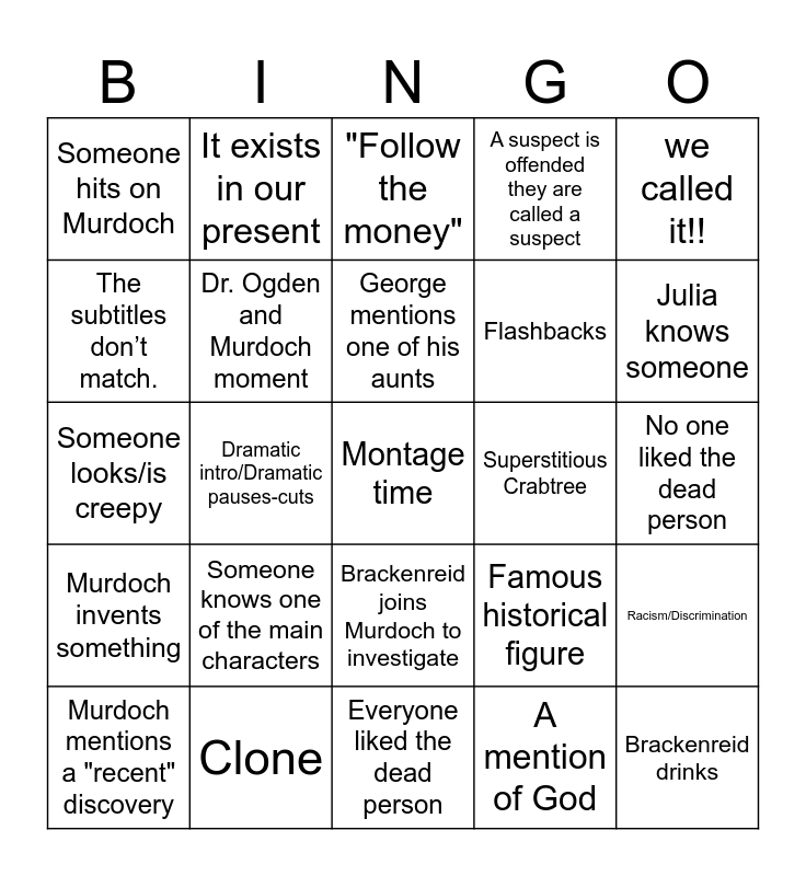 This bingo card has 34 words: Brackenreid drinks, A mention of God, There is blood, Brackenreid says Scottish/British slang, Murdoch invents something, Dr. Ogden and Murdoch moment, we called it!!, Murdoch mentions a "recent" discovery, It exists in our present, "What have you George?", George mentions one of his aunts, "Follow the money", Crabtree hits on someone, Murdoch rides his bike, Superstitious Crabtree, Julia knows someone, Clone, Someone looks/is creepy, Someone knows one of the main characters, Famous historical figure, Brackenreid joins Murdoch to investigate, "But sir", Someone hits on Murdoch, No one liked the dead person, Everyone liked the dead person, Montage time, A suspect is offended they are called a suspect, Murdoch imagines himself at the scene of the crime, Flashbacks, The subtitles don’t match., Supernatural, Dramatic intro/Dramatic pauses-cuts, Racism/Discrimination and Someone states the obvious.