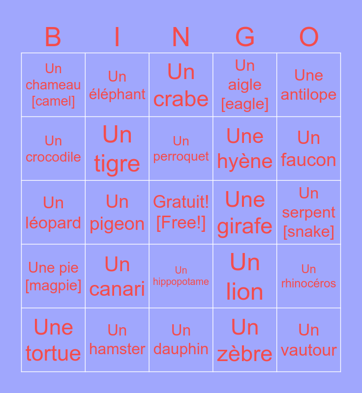 This bingo card has a free space and 24 words: Un canari, Un hamster, Un perroquet, Une tortue, Une antilope, Un chameau [camel], Un crocodile, Un éléphant, Une girafe, Un hippopotame, Une hyène, Un léopard, Un lion, Un rhinocéros, Un tigre, Un zèbre, Un serpent [snake], Un crabe, Un faucon, Un pigeon, Un vautour, Une pie [magpie], Un aigle [eagle] and Un dauphin.