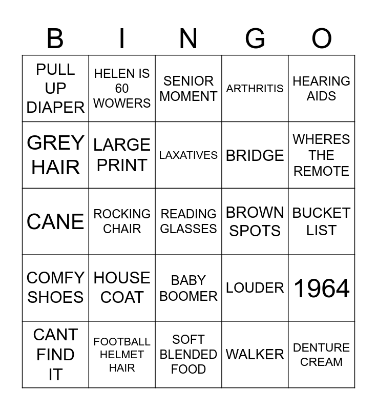 This bingo card has a free space and 40 words: ACHES AND PAINS, CANE, WRINKLES, LARGE PRINT, FOOTBALL HELMET HAIR, BABY BOOMER, LAXATIVES, VERTIGO, HEARING AIDS, COMFY SHOES, ROCKING CHAIR, ARTHRITIS, DENTURE CREAM, BUCKET LIST, BROWN SPOTS, HOUSE COAT, ANCIENT, PULL UP DIAPER, OVER THE HILL, SENIOR MOMENT, 1964, WALKER, BRIDGE, GREY HAIR, BALD, HOT FLUSH, FALSE TEETH, PASS WIND, TRIP OVER, FALL, DONE MY BACK, CANT FIND IT, WHAT YOU SAY, LOUDER, WHERES THE REMOTE, SOFT BLENDED FOOD, DISCOUNT, I'M OLD, HELEN IS 60 WOWERS and SHAKE WEAK.