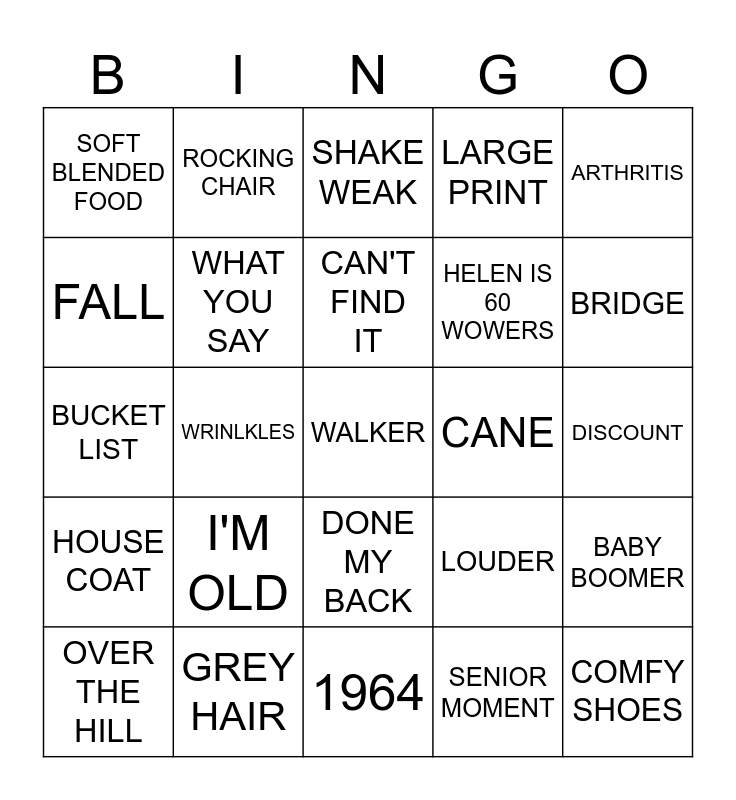 This bingo card has a free space and 40 words: PULL UP DIAPER, BUCKET LIST, TRIP OVER, WHAT YOU SAY, GREY HAIR, DONE MY BACK, CAN'T FIND IT, BALD, ARTHRITIS, HOUSE COAT, WRINLKLES, LARGE PRINT, COMFY SHOES, DISCOUNT, CANE, I'M OLD, ANCIENT, SOFT BLENDED FOOD, HOT FLUSH, SHAKE WEAK, BABY BOOMER, SENIOR MOMENT, HELEN IS 60 WOWERS, FALL, WHERE'S THE REMOTE, VERTIGO, FALSE TEETH, HERING AIDS, PASS WIND, BROWN SPOTS, DENTURE CREAM, OVER THE HILL, ACHES AND PAINS, LOUDER, BRIDGE, 1964, LAXATIVES, FOOTBALL HELMET HAIR, ROCKING CHAIR and SHAKE WEAK.