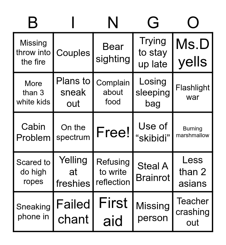 This bingo card has a free space and 34 words: Freshmen gets hurt, Missing person, Ambassador gets sick, Someone gets traumatized, Scared to do high ropes, Plans to sneak out, Ms.D yells, Sneaking phone in, Couples, Homesick, Complain about food, Bear sighting, Forgetting toiletries, Lost ____, Use of “skibidi”, Flashlight war, Failed chant, Cabin Problem, Yelling at freshies, Steal A Brainrot, Refusing to write reflection, Grow A Garden, Missing throw into the fire, Burning marshmallow, First aid, Teacher crashing out, Trying to stay up late, Random thing in shower, Losing sleeping bag, More than 3 white kids, Queen bee, On the spectrum, Less than 2 asians and Ragebait.