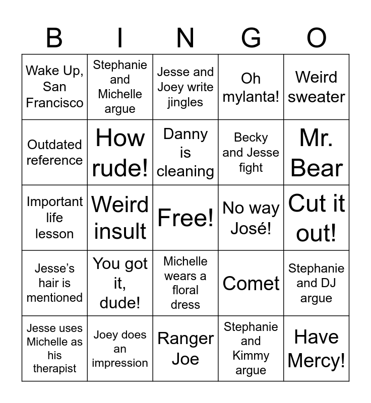 This bingo card has a free space and 40 words: Elvis is mentioned, Important life lesson, DJ is studying, How rude!, Joey does an impression, Michelle wears a floral dress, Danny is cleaning, Cooking goes wrong, Weird sweater, Jesse’s hair is mentioned, Weird insult, Oh mylanta!, Have Mercy!, Cut it out!, No way José!, You got it, dude!, Someone wears neon, Wake Up, San Francisco, Jesse sings a song, Jesse and Joey write jingles, Stephanie and DJ argue, Stephanie and Kimmy argue, Becky and Jesse fight, Outdated reference, Kimmy barges in, Danny, Jesse or Joey are dating a random girl who will never show up again, Pam is mentioned, An animal is in the house, Joey is disgusting, Kimmy has smelly feet, Michelle is annoying, Jesse uses Michelle as his therapist, Baby babbles, Comet, Mr. Bear, Ranger Joe, Rush Hour Renegades, Sad music, Stephanie and Michelle argue and Woah baby!.
