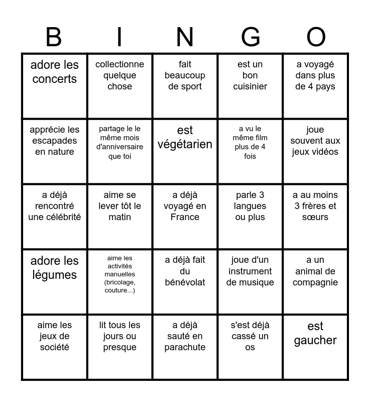 This bingo card has 25 words: aime les activités manuelles (bricolage, couture...), a déjà sauté en parachute, est végétarien, aime les jeux de société, a voyagé dans plus de 4 pays, adore les concerts, apprécie les escapades en nature, collectionne quelque chose, parle 3 langues ou plus, a déjà fait du bénévolat, a vu le même film plus de 4 fois, a déjà rencontré une célébrité, joue d'un instrument de musique, a un animal de compagnie, partage le le même mois d'anniversaire que toi, est gaucher, a au moins 3 frères et sœurs, fait beaucoup de sport, joue souvent aux jeux vidéos, aime se lever tôt le matin, a déjà voyagé en France, lit tous les jours ou presque, adore les légumes, est un bon cuisinier and s'est déjà cassé un os.
