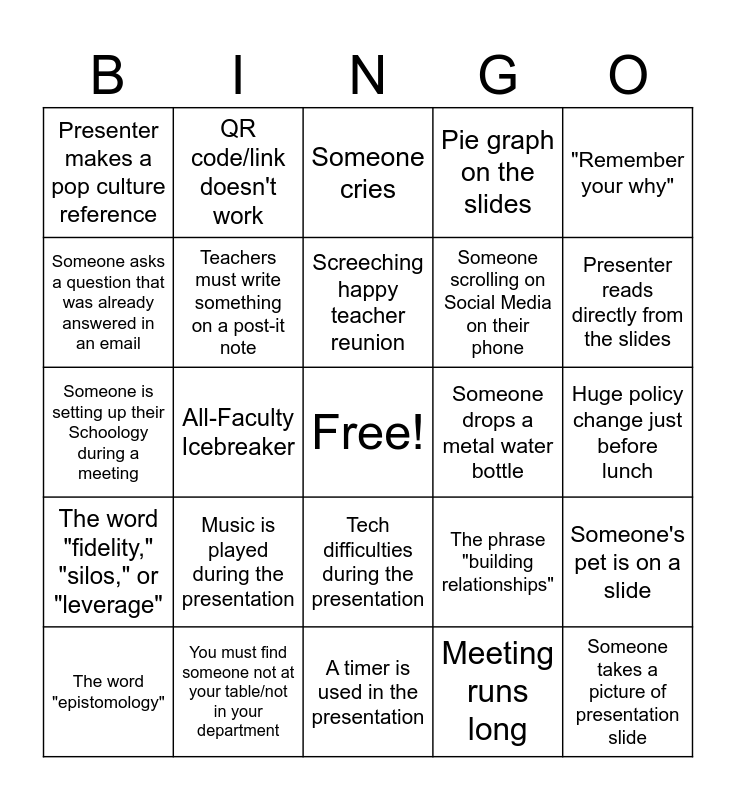 This bingo card has a free space and 40 words: Principal or other admin walks to the back of the room to watch, Someone is setting up their Schoology during a meeting, There's a gallery walk, Teachers must write something on a post-it note, You must find someone not at your table/not in your department, Tech difficulties during the presentation, Screeching happy teacher reunion, "We will do everything we can to get you outta here early", "Remember your why", The word "fidelity," "silos," or "leverage", All-Faculty Icebreaker, Pie graph on the slides, Someone takes a picture of presentation slide, Huge policy change just before lunch, Someone drops a metal water bottle, Music is played during the presentation, Not enough handouts for everyone, Presenter makes a pop culture reference, Someone can't stop sneezing or coughing, Someone cries, Someone's pet is on a slide, Meeting runs long, Someone scrolling on Social Media on their phone, Someone asks a question that was already answered in an email, Markers on the table, Someone's kid is on a slide, Microphone doesn't work, Someone insists that everyone can hear them, Presenter answers a question that no one heard, "Sit with your homeroom partner", Someone eating breakfast at a table, The word "epistomology", Blank posters on the wall for writing, The phrase "building relationships", Presenter reads directly from the slides, A timer is used in the presentation, Bar graph on the slides, Activity where you must exchange something with someone, QR code/link doesn't work and Speaker doesn't work for video.