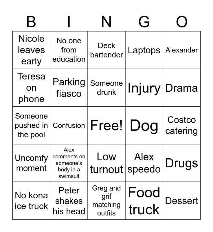 This bingo card has a free space and 24 words: Alex comments on someone’s body in a swimsuit, Peter shakes his head, Someone drunk, No kona ice truck, Alexander, Nicole leaves early, Teresa on phone, No one from education, Dog, Low turnout, Injury, Someone pushed in the pool, Alex speedo, Drugs, Parking fiasco, Food truck, Costco catering, Deck bartender, Drama, Confusion, Dessert, Uncomfy moment, Laptops and Greg and grif matching outfits.