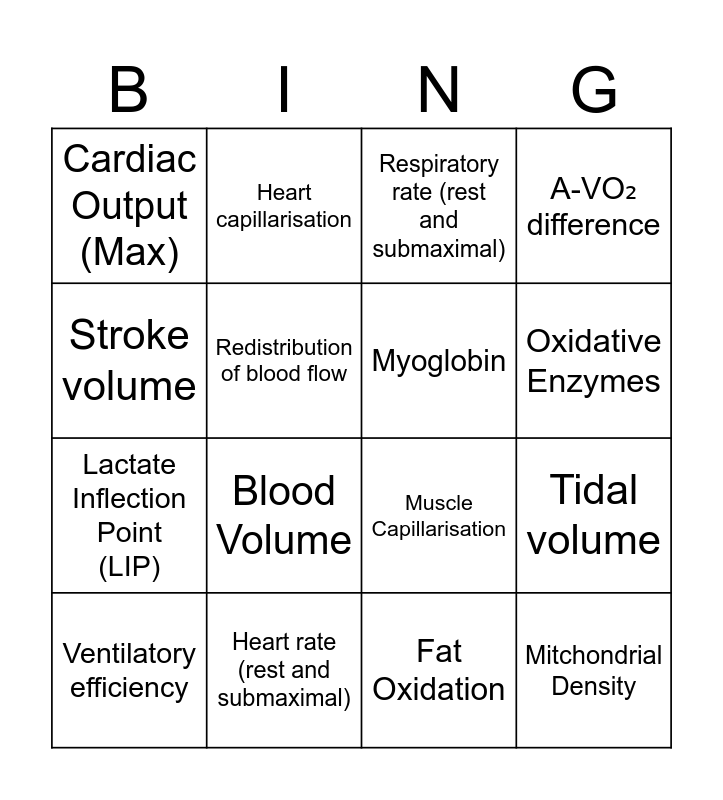 This bingo card has 20 words: Tidal volume, Pulmonary and alveolar Diffusion, Respiratory rate (rest and submaximal), Ventilation (max), Ventilatory efficiency, Stroke volume, Heart rate (rest and submaximal), Cardiac Output (Max), Lactate Inflection Point (LIP), Heart capillarisation, Blood Volume, Muscle Capillarisation, Redistribution of blood flow, Mitchondrial Density, Myoglobin, Glycogen stores, Oxidative Enzymes, A-VO₂ difference, Fat Oxidation and VO₂ max.