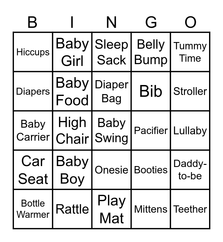 This bingo card has 25 words: Baby Boy, Play Mat, Diaper Bag, Bottle Warmer, Tummy Time, Hiccups, Diapers, Baby Girl, Pacifier, Onesie, Bib, Baby Carrier, Booties, Daddy-to-be, Baby Food, Teether, Lullaby, Sleep Sack, Stroller, High Chair, Baby Swing, Rattle, Car Seat, Belly Bump and Mittens.