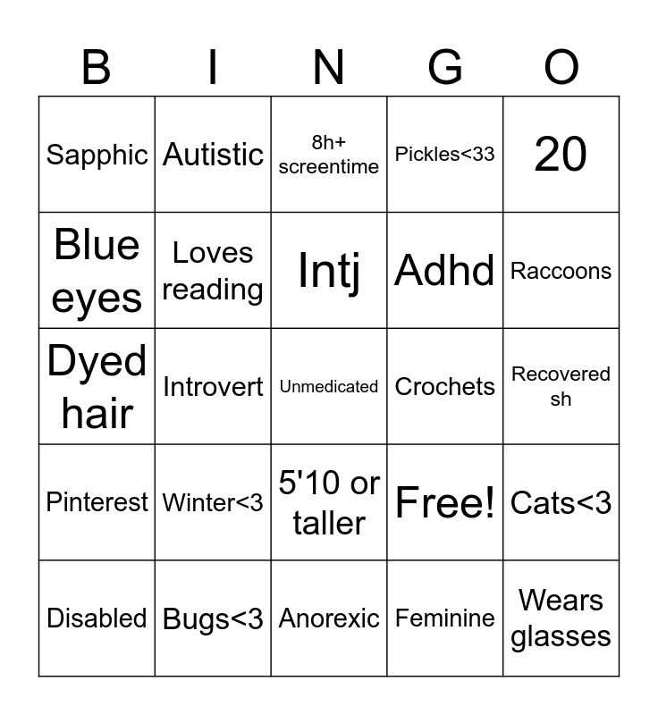 This bingo card has 25 words: Winter<3, Anorexic, Intj, Disabled, 20, Sapphic, Blue eyes, Autistic, Crochets, 5'10 or taller, Adhd, Dyed hair, Free!, Cats<3, Loves reading, Wears glasses, Recovered sh, 8h+ screentime, Raccoons, Introvert, Unmedicated, Bugs<3, Pinterest, Pickles<33 and Feminine.