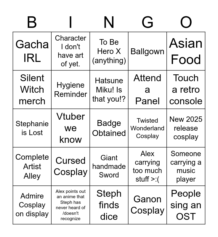 This bingo card has a free space and 24 words: Cursed Cosplay, Alex points out an anime that Steph has never heard of /doesn't recognize, Hatsune Miku! Is that you!?, Admire Cosplay on display, Asian Food, Gacha IRL, Silent Witch merch, Character I don't have art of yet., Twisted Wonderland Cosplay, Giant handmade Sword, Attend a Panel, Stephanie is Lost, Alex carrying too much stuff >:(, Someone carrying a music player, Hygiene Reminder, Ganon Cosplay, New 2025 release cosplay, To Be Hero X (anything), Touch a retro console, Vtuber we know, People sing an OST, Complete Artist Alley, Ballgown and Steph finds dice.
