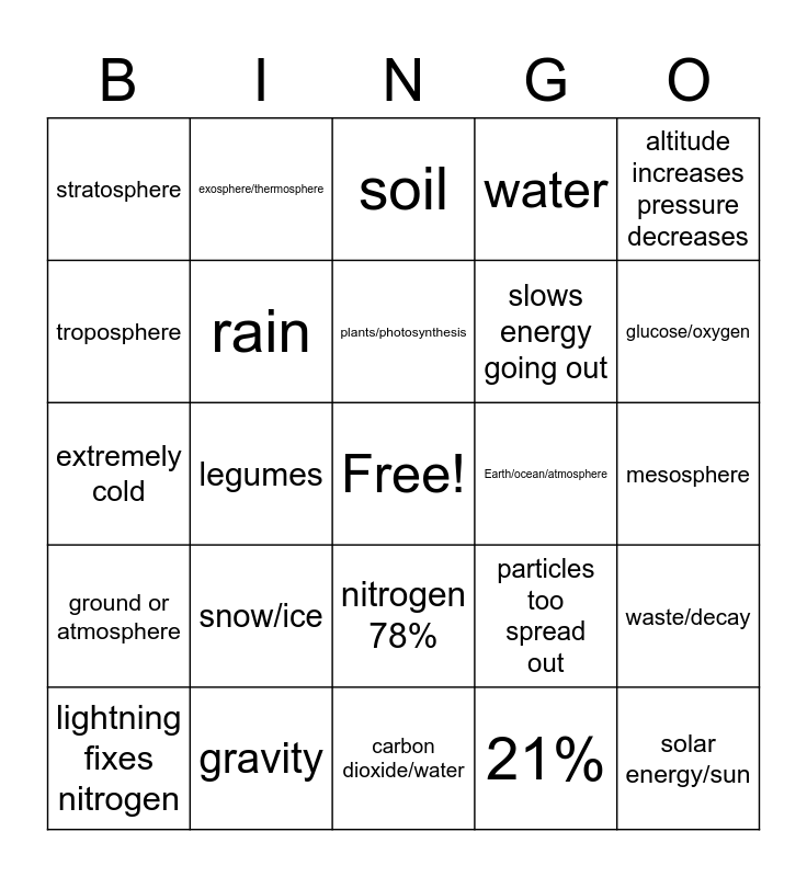 This bingo card has a free space and 26 words: nitrogen 78%, 21%, plants/photosynthesis, gravity, altitude increases pressure decreases, stratosphere, troposphere, exosphere/thermosphere, mesosphere, particles too spread out, slows energy going out, extremely cold, waste/decay, lightning fixes nitrogen, legumes, atmosphere, water, ground or atmosphere, soil, solar energy/sun, glucose/oxygen, carbon dioxide/water, Earth/ocean/atmosphere, snow/ice, rain and water vapor.