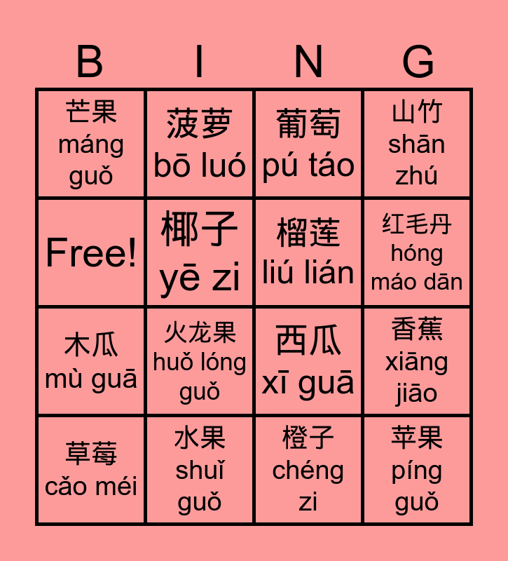 This bingo card has 16 words: 水果 shuǐ guǒ, 香蕉 xiāng jiāo, 葡萄 pú táo, 芒果 máng guǒ, 木瓜 mù guā, 菠萝 bō luó, 西瓜 xī guā, 橙子 chéng zi, Free!, 椰子 yē zi, 草莓 cǎo méi, 山竹 shān zhú, 火龙果 huǒ lóng guǒ, 红毛丹 hóng máo dān, 榴莲 liú lián and 苹果 píng guǒ.