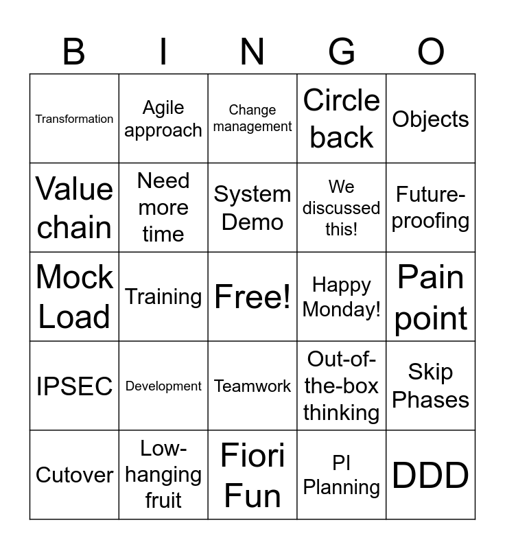 This bingo card has 72 words: DSD, Agile approach, Free!, R&M Workflow, Transport Requests, ADO Updates, Need more time, Alignment session, Happy Monday!, SoS, Cutover, SAPanese, System Demo, Circle back, Decision Log, Mock Load, Build, Change management, SSAM, Objects, IPSEC, Development, Fiori Fun, Data Data Data, Skip Phases, Out of scope, Deliverables, Sirius, Schedule driven, Polaris, FIT, End-to-end solution, Design thinking, Framework, Future-proofing, Gap analysis, Wish List, Can we do this?, We discussed this!, Oracle, Low-hanging fruit, Implementation roadmap, FSM / SiteView, Move the needle, Operational efficiency, Out-of-the-box thinking, Pain point, BPD, Operational excellence, Quick wins, DDD, Risk mitigation, Roadmap, Teamwork, PI Planning, Stories, Transformation, Training, At our time, Strategic fit, Workpack, Go-live, Test Data, Strategic alignment, To-be model, Value-add, Value chain, Value proposition, Time to market, Workflow optimization, MOC and Win-win.
