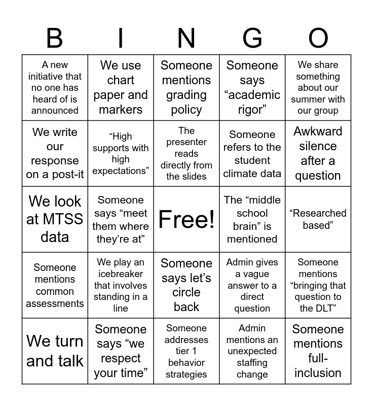 This bingo card has a free space and 24 words: We play an icebreaker that involves standing in a line, Someone says “we respect your time”, The presenter reads directly from the slides, We turn and talk, We share something about our summer with our group, A new initiative that no one has heard of is announced, We write our response on a post-it, We use chart paper and markers, The “middle school brain” is mentioned, Someone says let’s circle back, Someone refers to the student climate data, We look at MTSS data, Admin gives a vague answer to a direct question, Someone mentions “bringing that question to the DLT”, “High supports with high expectations”, Admin mentions an unexpected staffing change, “Researched based”, Someone mentions grading policy, Awkward silence after a question, Someone says “meet them where they’re at”, Someone mentions full-inclusion, Someone mentions common assessments, Someone says “academic rigor” and Someone addresses tier 1 behavior strategies.