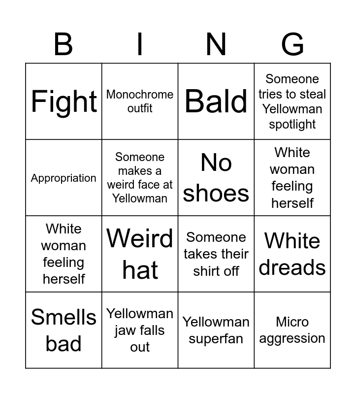 This bingo card has 20 words: White dreads, Smoking weed inside, Bald, Had maxed out their Medicare benefits, Smells bad, Appropriation, Yellowman jaw falls out, Fight, White woman feeling herself, Monochrome outfit, Weird hat, Someone takes their shirt off, Someone makes a weird face at Yellowman, Micro aggression, No shoes, Old people flirting, White woman feeling herself, Someone tries to steal Yellowman spotlight, Yellowman superfan and Yellowman says something very not PC.