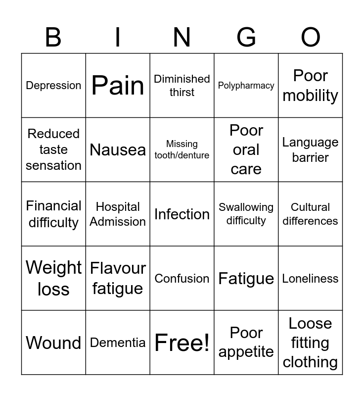 This bingo card has 25 words: Weight loss, Dementia, Infection, Poor appetite, Poor mobility, Depression, Pain, Diminished thirst, Swallowing difficulty, Loneliness, Reduced taste sensation, Nausea, Free!, Fatigue, Language barrier, Wound, Hospital Admission, Missing tooth/denture, Poor oral care, Cultural differences, Financial difficulty, Flavour fatigue, Confusion, Polypharmacy and Loose fitting clothing.