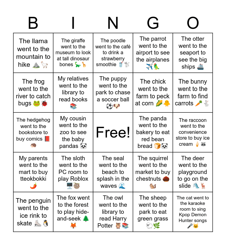 This bingo card has a free space and 33 words: My aunt went to the aquarium to watch the fish swim π , My uncle went to the amusement park to ride the roller coaster π’, My cousin went to the zoo to see the baby pandas πΌ, My grandparents went to the movie theater to watch Zombie Daughter π¬, My parents went to the mart to buy tteokbokki πΆοΈ, My relatives went to the library to read books π, The otter went to the seaport to see the big ships π’, The penguin went to the ice rink to skate βΈοΈπ§, The giraffe went to the museum to look at tall dinosaur bones π¦π¦, The crested gecko went to the garden to sit on a flower π¦πΈ, The puppy went to the park to chase a soccer ball β½πΆ, The poodle went to the cafΓ© to drink a strawberry smoothie π₯€π©, The capybara went to the jjimjilbang to take a warm bath ππ¦«, The hamster went to the academy to learn ABCs ππΉ, The panda went to the bakery to eat red bean bread ππΌ, The bunny went to the farm to find carrots π₯π, The fox went to the forest to play hide-and-seek π²π¦, The hedgehog went to the bookstore to buy comics ππ¦, The sloth went to the PC room to play Roblox π₯οΈπ¦₯, The squirrel went to the market to buy chestnuts π°πΏοΈ, The seal went to the beach to splash in the waves π, The koala went to the park to nap in a tree π³π¨, The llama went to the mountain to hike β°οΈπ¦, The raccoon went to the convenience store to buy ice cream π¦π¦, The owl went to the library to read Harry Potter π¦π, The cat went to the karaoke room to sing Kpop Demon Hunter songs π€π±, The parrot went to the airport to see the airplanes βοΈπ¦, The chick went to the farm to peck at corn π½π₯, The frog went to the river to catch bugs πΈπ, The deer went to the playground to go on the slide ππ¦, The turtle went to the seaport to watch the ferry β΄οΈπ’, The sheep went to the park to eat green grass ππΏ and Jisoo went to the movie theater to watch Demon Slayer βοΈπΈ.