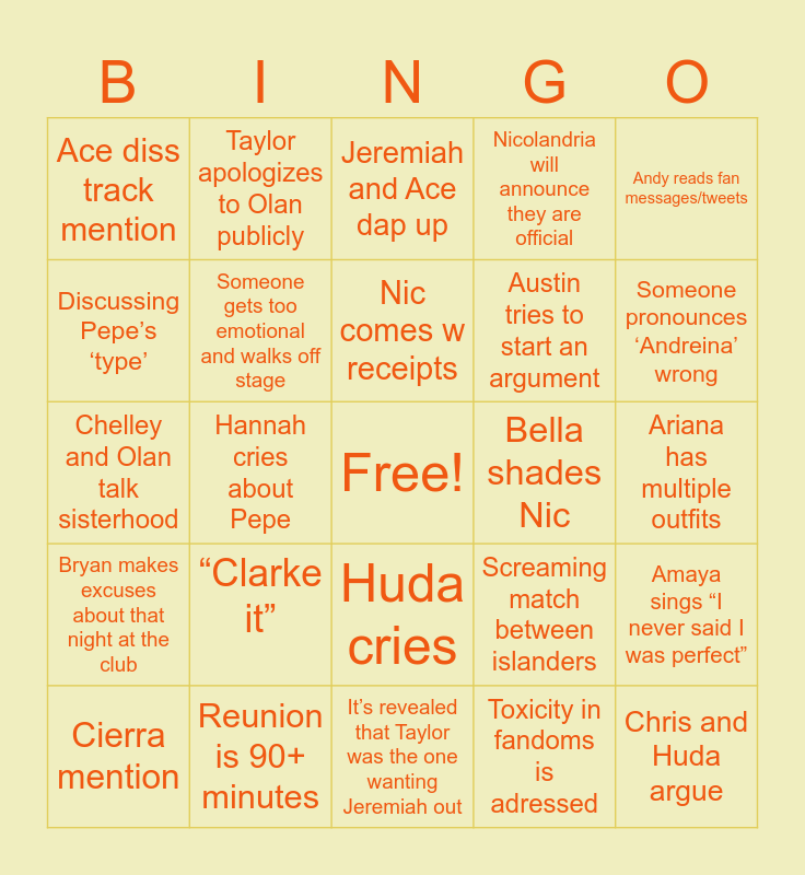 This bingo card has a free space and 24 words: “Clarke it”, Reunion is 90+ minutes, Nic comes w receipts, Cierra mention, Andy reads fan messages/tweets, Ace diss track mention, Discussing Pepe’s ‘type’, Taylor apologizes to Olan publicly, Bella shades Nic, Huda cries, Austin tries to start an argument, Chelley and Olan talk sisterhood, Screaming match between islanders, Amaya sings “I never said I was perfect”, Someone gets too emotional and walks off stage, Toxicity in fandoms is adressed, Ariana has multiple outfits, Jeremiah and Ace dap up, Someone pronounces ‘Andreina’ wrong, Hannah cries about Pepe, Chris and Huda argue, Bryan makes excuses about that night at the club, Nicolandria will announce they are official and It’s revealed that Taylor was the one wanting Jeremiah out.