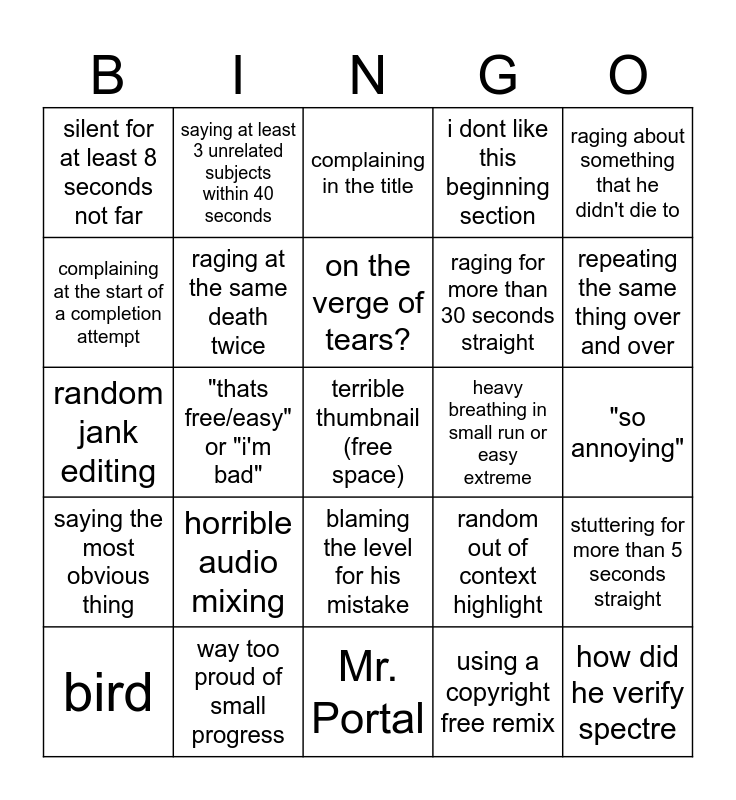 This bingo card has a free space and 32 words: using a copyright free remix, switches up on a level suddenly, "thats free/easy" or "i'm bad", unintelligible accent, saying the most obvious thing, raging at the same death twice, raging about something that he didn't die to, stuttering for more than 5 seconds straight, saying at least 3 unrelated subjects within 40 seconds, ran out of breath from complaining, on the verge of tears?, complaining in the title, curses out the level in the reaction, far too dramatic reaction, heavy breathing in small run or easy extreme, calling something a bug that isnt a bug, bird, random jank editing, blaming the level for his mistake, horrible audio mixing, random out of context highlight, "not good", "so annoying", way too proud of small progress, how did he verify spectre, i dont like this beginning section, raging for more than 30 seconds straight, complaining at the start of a completion attempt, silent for at least 8 seconds not far, Mr. Portal, complaining about a new best 15% or more than the previous and repeating the same thing over and over.