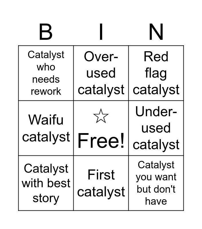 This bingo card has a free space and 8 words: Waifu catalyst, Over-used catalyst, Under-used catalyst, Catalyst with best story, Red flag catalyst, Catalyst who needs rework, First catalyst and Catalyst you want but don't have.