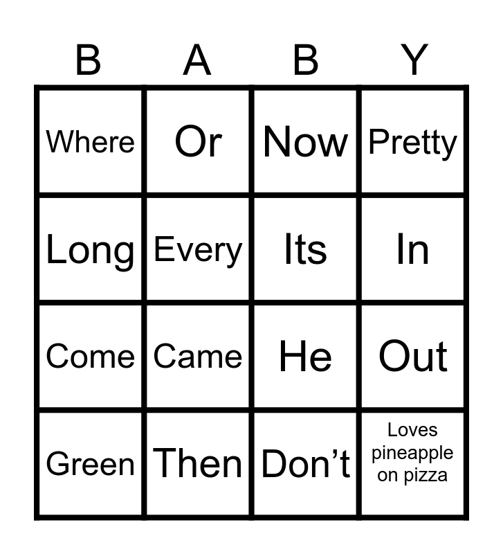 This bingo card has 127 words: Likes to drink Milk, Used to play with Barbie dolls, Can cook a full dinner without a recipe, Still owns a childhood stuffed animal, Can sing all the lyrics to a 2000s pop song, Is NOT a morning person, Loves pineapple on pizza, Is wearing something blue tonight, Has a hidden talent, Still watches cartoons, Still knows a clapping game or hand rhyme from childhood, Would go on a reality TV show, Is the “Mum” of the group, Got detention or in trouble at school, Had a childhood dream job that's totally different from what they do now, Is the go-to person at work for gossip, For, Girl, Go, Had, Have, He, Her, Him, His, I, In, Is, It, Little, Look, Of, On, Out, Said, See, She, Some, That, The, Then, There, They, To, Up, Was, We, Were, What, When, With, You, About, After, About, An, Any, Are, Around, Ask, Away, Before, Big, Blue, Brown, By, Call, Came, Come, Day, Don’t, Every, Five, Four, From, Get, Going, Good, Got, Green, Has, Help, Here, How, If, Into, Its, Jump, Just, Know, Like, Long, Make, Me, My, No, Now, Old, One, Or, Over, Pretty, Put, Red, Ride, Right, Saw, Sleep, Take, Their, Them, This, Too, Two, Very, Walk, Want, Water, Way, Well, Went, Where, Will, Would, Yellow, Yes and Your.