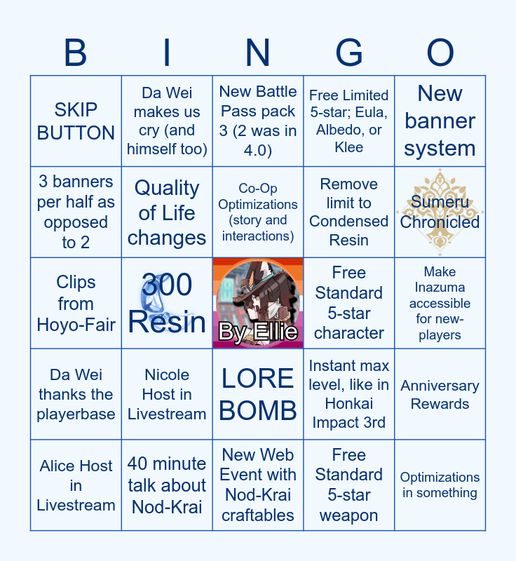 This bingo card has 2 images, a free space and 24 words: Nicole Host in Livestream, 40 minute talk about Nod-Krai, Co-Op Optimizations (story and interactions), Alice Host in Livestream, New banner system, SKIP BUTTON, 3 banners per half as opposed to 2, Da Wei makes us cry (and himself too), Free Standard 5-star character, LORE BOMB, Remove limit to Condensed Resin, Clips from Hoyo-Fair, Instant max level, like in Honkai Impact 3rd, Anniversary Rewards, Quality of Life changes, Free Standard 5-star weapon, Make Inazuma accessible for new-players, New Battle Pass pack 3 (2 was in 4.0), Sumeru Chronicled, 300 Resin, Optimizations in something, Da Wei thanks the playerbase, Free Limited 5-star; Eula, Albedo, or Klee and New Web Event with Nod-Krai craftables.