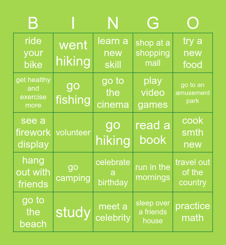 This bingo card has a free space and 24 words: go to the beach, go camping, go to the cinema, sleep over a friends house, try a new food, ride your bike, went hiking, learn a new skill, read a book, cook smth new, see a firework display, go fishing, run in the mornings, travel out of the country, get healthy and exercise more, study, meet a celebrity, shop at a shopping mall, go to an amusement park, hang out with friends, volunteer, celebrate a birthday, play video games and practice math.