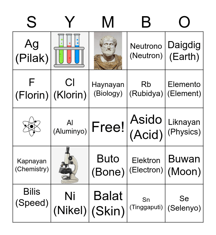 This bingo card has 4 images, a free space and 20 words: Ni (Nikel), Haynayan (Biology), Bilis (Speed), Daigdig (Earth), Ag (Pilak), F (Florin), Asido (Acid), Buto (Bone), Rb (Rubidya), Elektron (Electron), Buwan (Moon), Cl (Klorin), Sn (Tinggaputi), Liknayan (Physics), Elemento (Element), Al (Aluminyo), Se (Selenyo), Kapnayan (Chemistry), Neutrono (Neutron) and Balat (Skin).