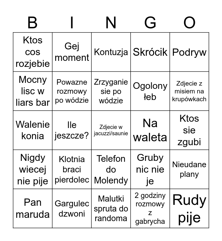 This bingo card has 25 words: Klotnia braci pierdolec, Malutki spruta do randoma, Zrzyganie sie po wódzie, Pan maruda, Podryw, Ktos cos rozjebie, Mocny lisc w liars bar, Gej moment, Na waleta, Telefon do Molendy, Ogolony łeb, Walenie konia, Gruby nic nie je, Nieudane plany, Powazne rozmowy po wódzie, Rudy pije, Ktos sie zgubi, Kontuzja, Zdjecie z misiem na krupówkach, Ile jeszcze?, Zdjecie w jacuzzi/saunie, Gargulec dzwoni, Nigdy wiecej nie pije, Skrócik and 2 godziny rozmowy z gabrycha.